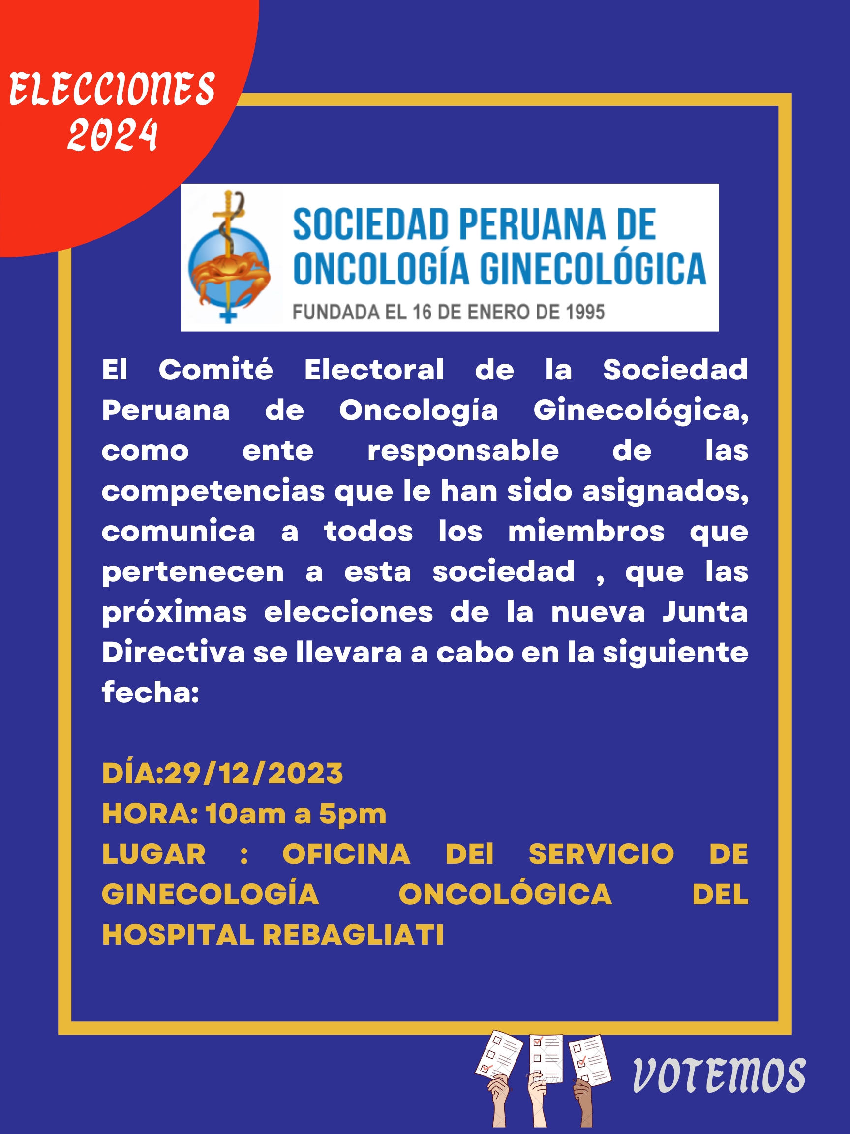 El viernes 29 de diciembre del 2023 se llevara a cabo las elecciones a para Consejo Directivo 2024 de 10:00 am a 17:00 horas en la Oficicna del Servicio Ginecología Oncológica del Hospital Edgardo Rebagliati .